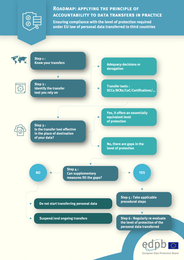 Der Europäische Datenschutzausschuss (EDSA) hat dazu eine Empfehlung veröffentlicht, die noch bis zum 21. Dezember 2020 zur öffentlichen Konsultation aufliegt. (Update der Datenschutzstelle: Seit dem 18. Juni 2021 liegt die finale Version der Empfehlung vor.) Das Dokument beschreibt im Kern eine 6-stufige Vorgehensweise, um den Datenexporteur bei der Abklärung allfälliger zusätzlicher Massnahmen zu den rechtlichen Instrumenten bzw. geeigneten Garantien für Datentransfers in Drittstaaten zu unterstützen (Grafik).